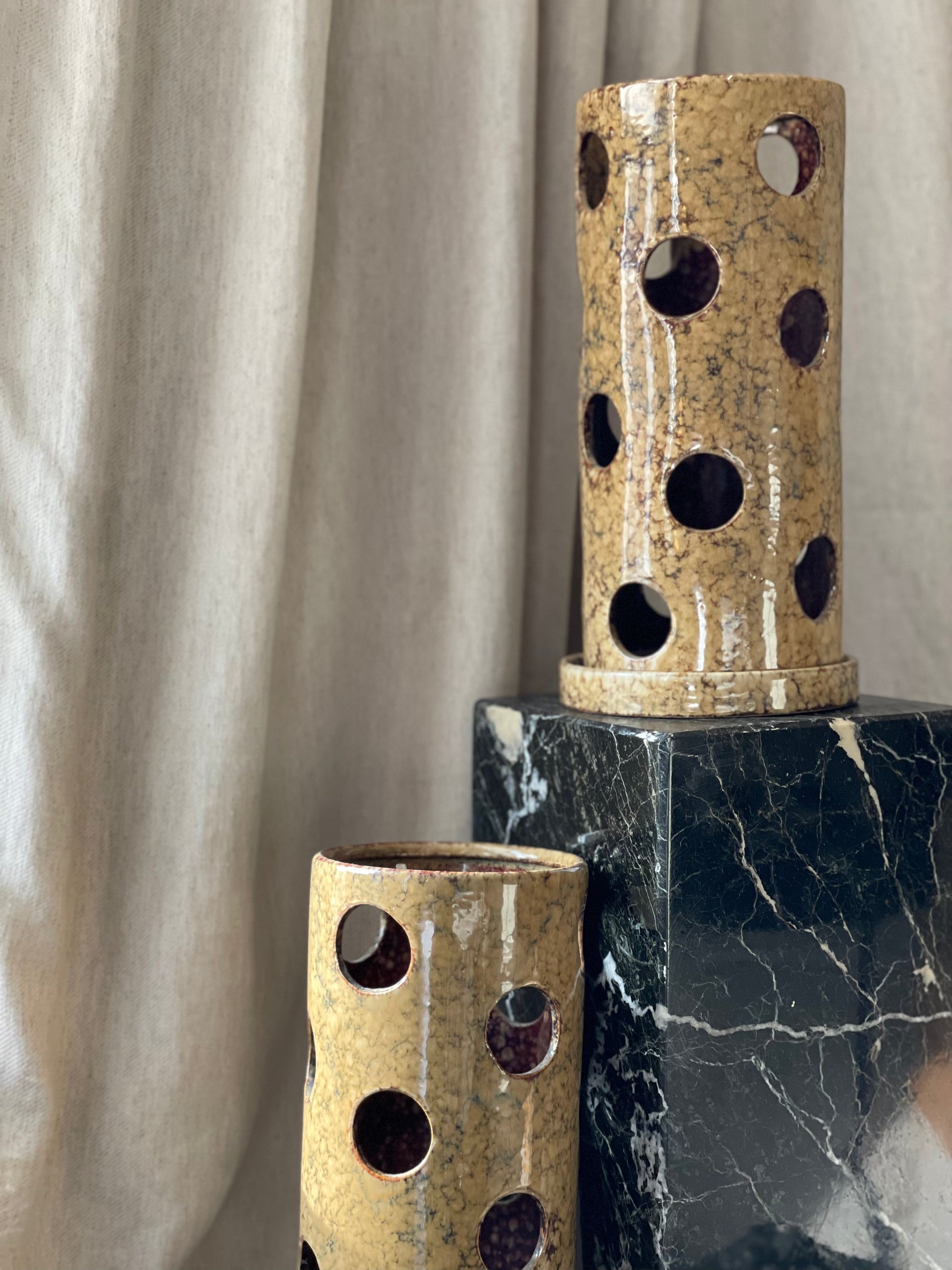 A large pair of decorative tea light holders in a soft brown with circular light holes. These come with base plates for the candle or tea light.