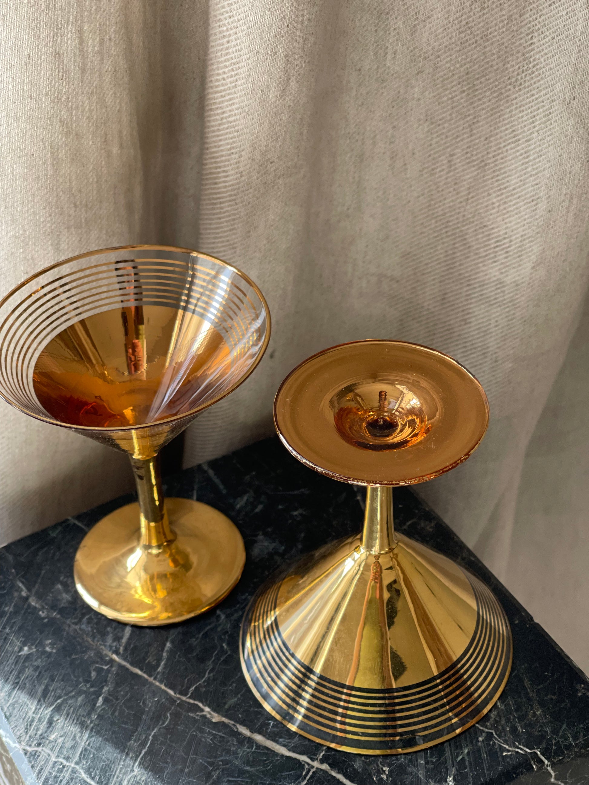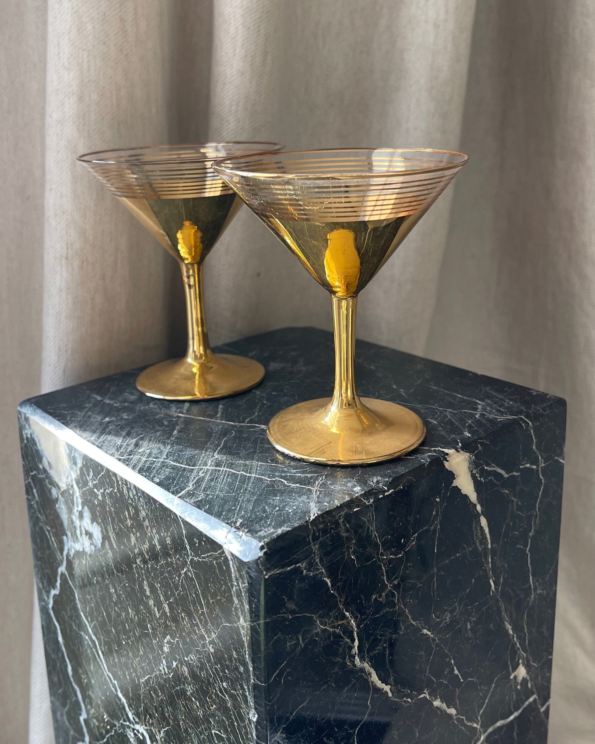 Gold pair of martini cocktail glasses with glass striped rimmed detailing.