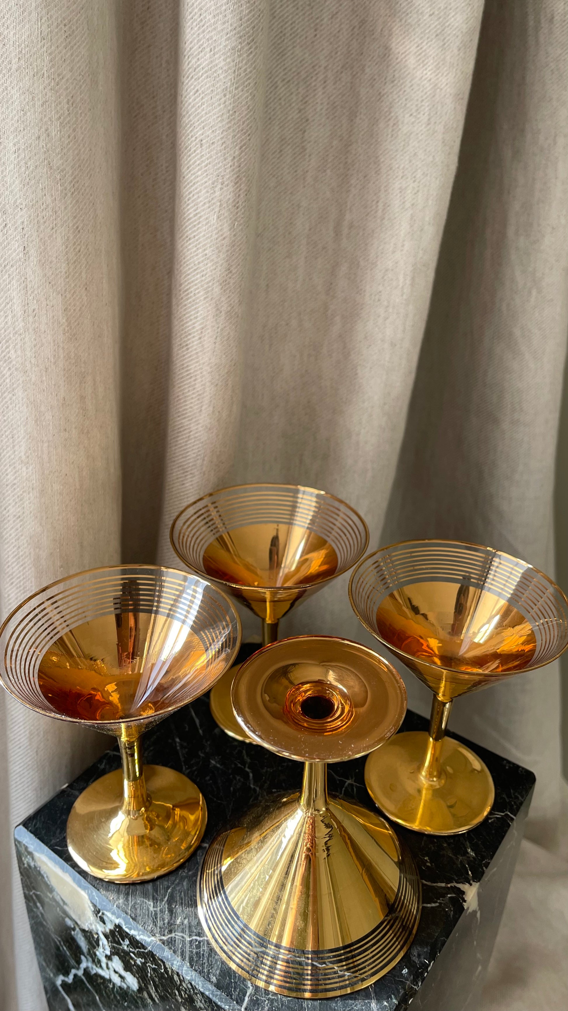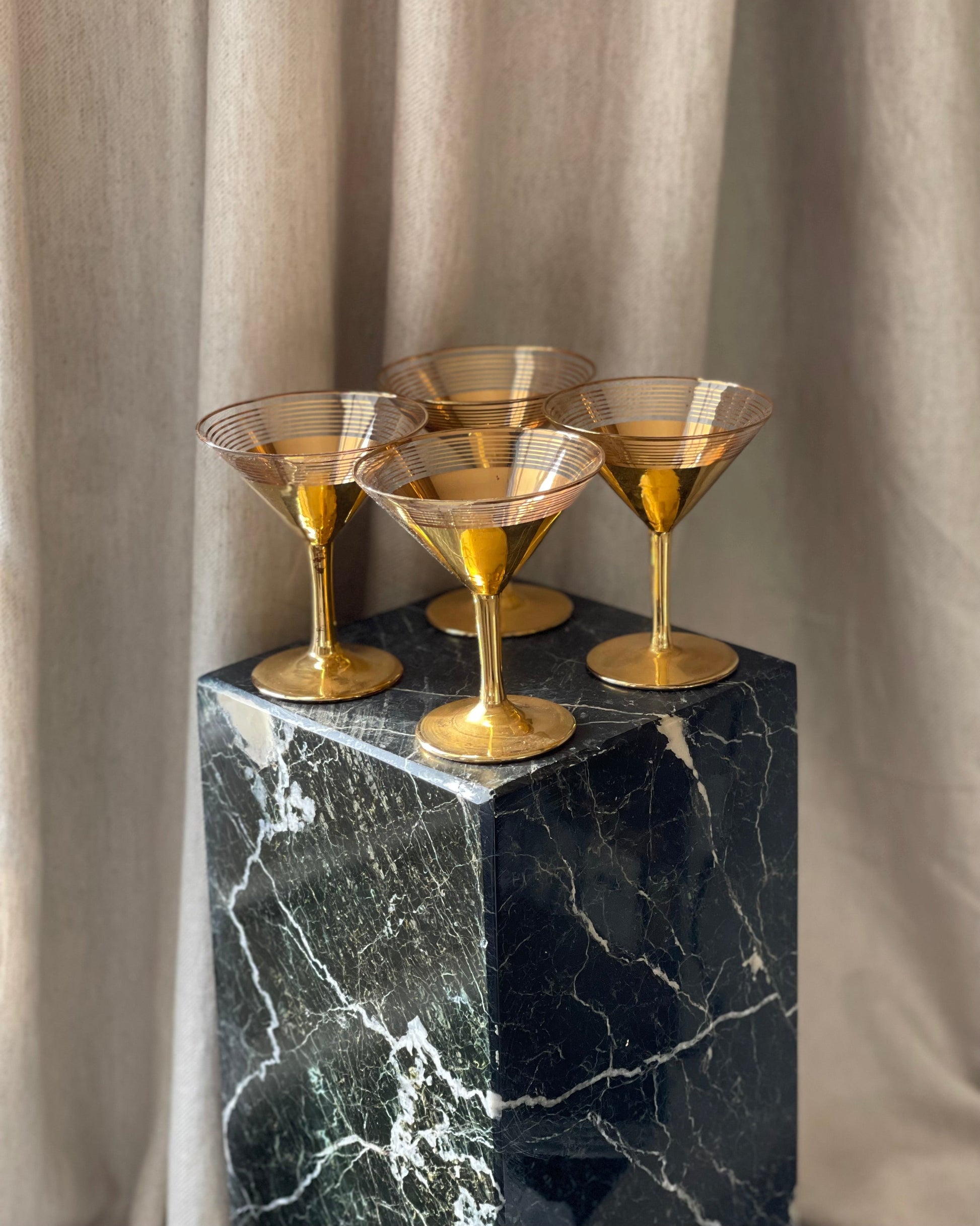 Gold set of 4 Martini glasses with clear glass striped rimmed detailing.